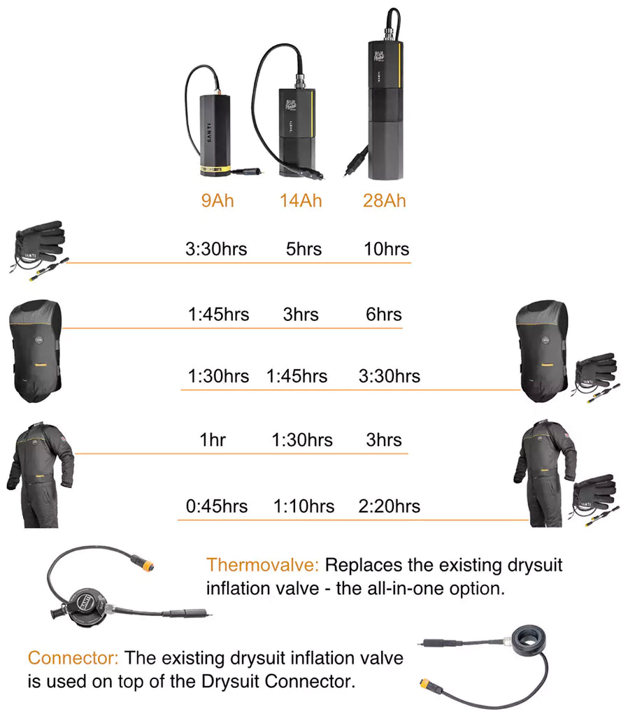 To operate the Santi Heating system a Santi Drysuit Connector or Thermovalve 303 is required.