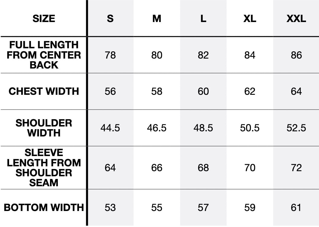 SIZING GUIDE NOTE: The measurements are in cm and are measurements of the actual jacket laid flat, not persons.